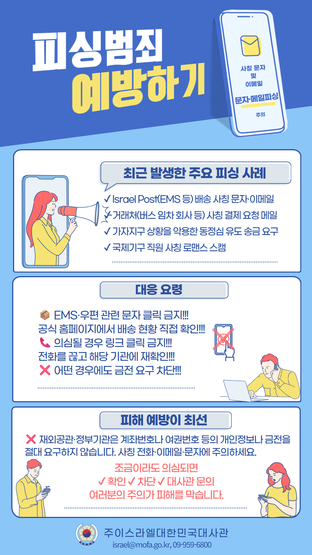 최근 문자나 메일을 이용한 피싱 범죄 사례가 이스라엘에서도 발생함에 따라, 이스라엘을 방문・︎체류하시는 우리 국민들께서는 보이스피싱 범죄예방 및 경각심 제고를 위해 아래와 같이 대응 요령을 숙지하시고 피해 예방에 각별히 유의해 주시기 바랍니다.